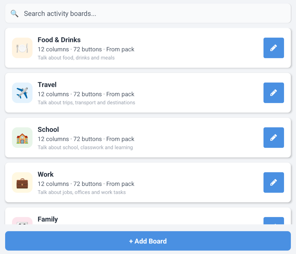Des tableaux de communication thematiques adaptes a des routines, environnements et activites precis. Creez un tableau pour les repas, un autre pour l'ecole et passez de l'un a l'autre d'un geste.
